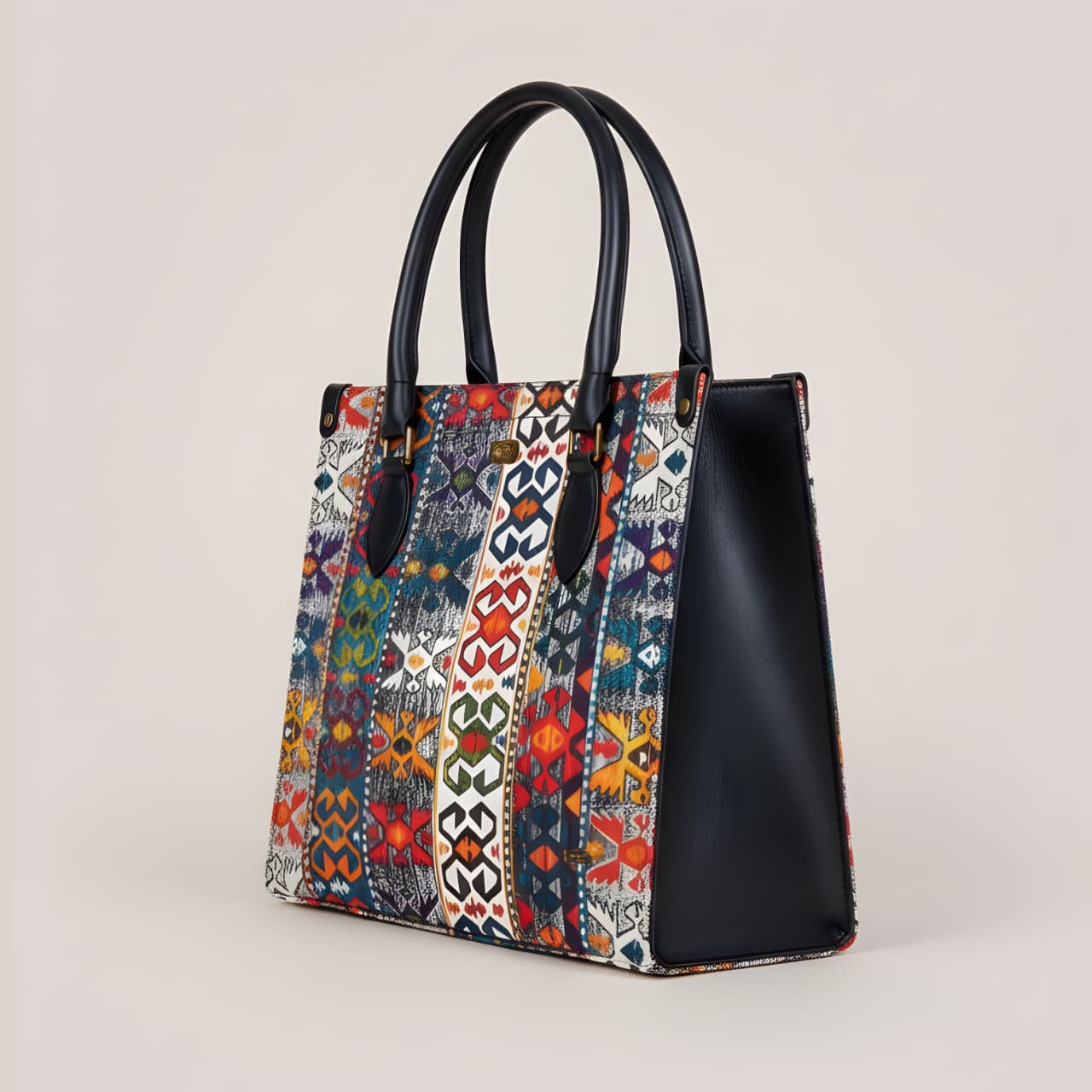 Make a bold statement with this structured Ethnic Print Tote Bag. Add this vibrant piece to your cart before it sells out!