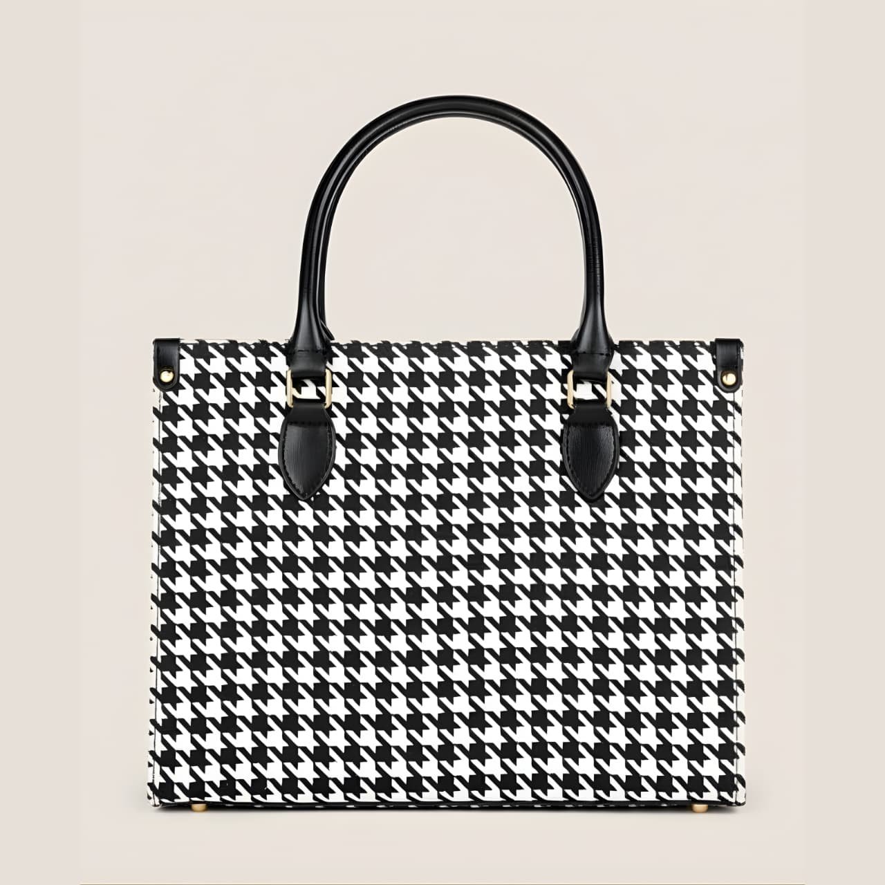 A premium, structured Black and White Houndstooth Handbag. Perfect size for office and daily essentials. Features durable PU Leather and elegant gold-tone accents. Shop now for a limited-time price!